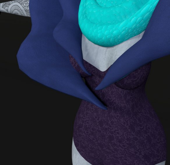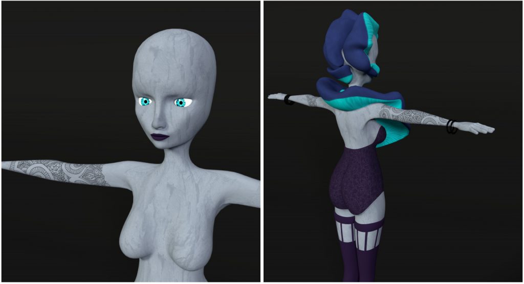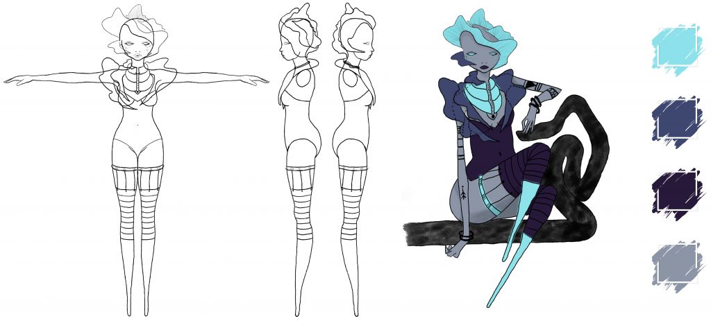 Hidaya is a very feminine character and I wanted to express this with her clothes. That is why she wears lingerie. The tattoos, the bracelets and the snakelike neck rings are based on the native appearance of Hidayas tribe.