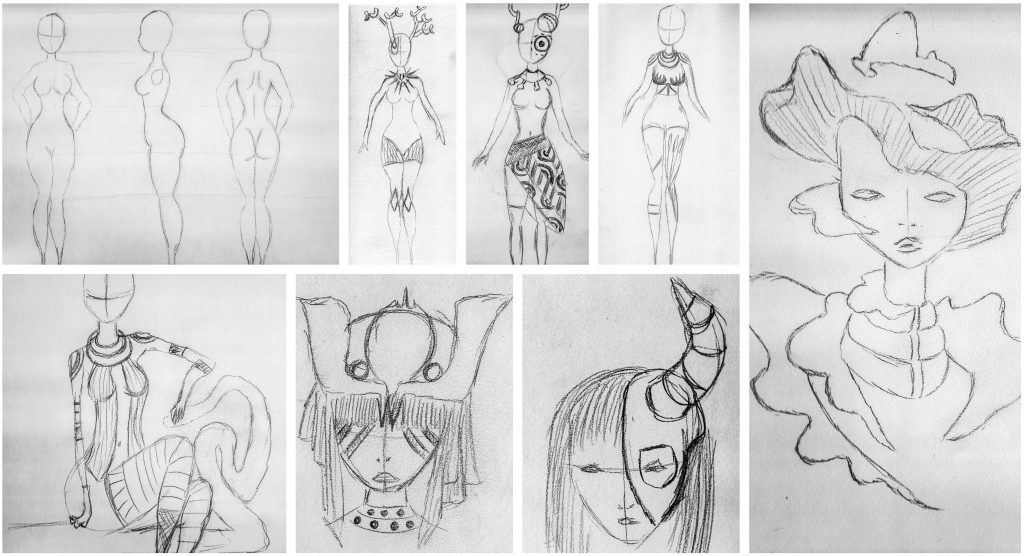 After this I started drawing the first sketches on paper. I experimented with different shapes and transferred my favourite one, a mystical looking creature with tree mushrooms around the head, into Photoshop. Then I finished the sketches with the t-pose, which was used for the modeling.