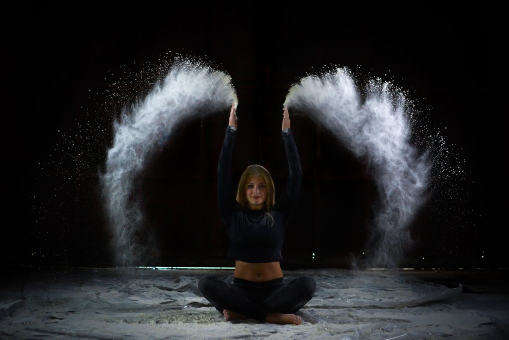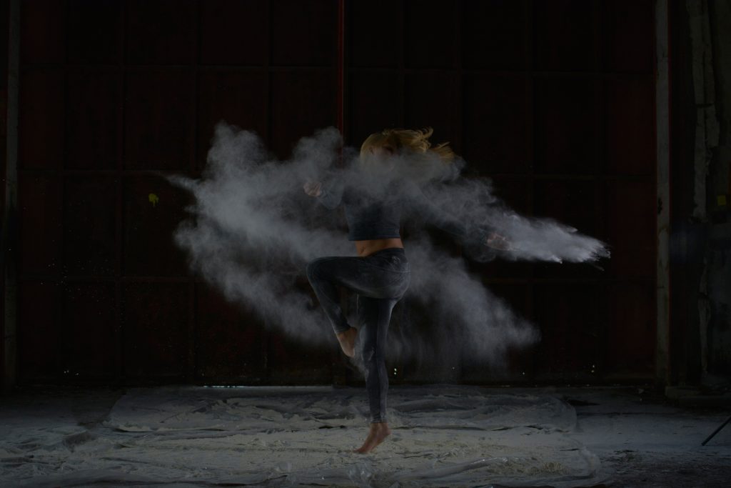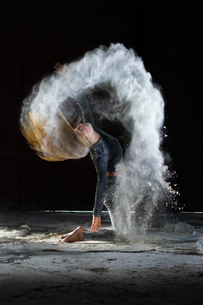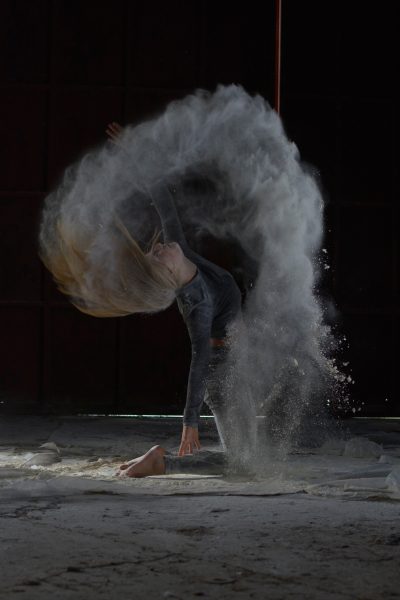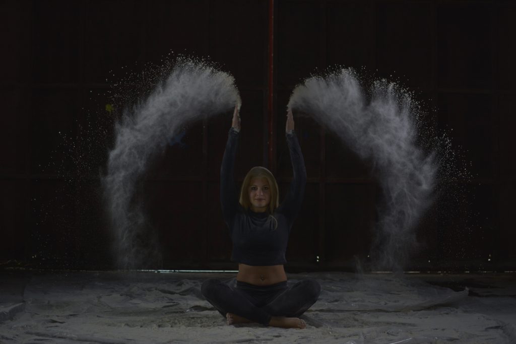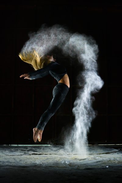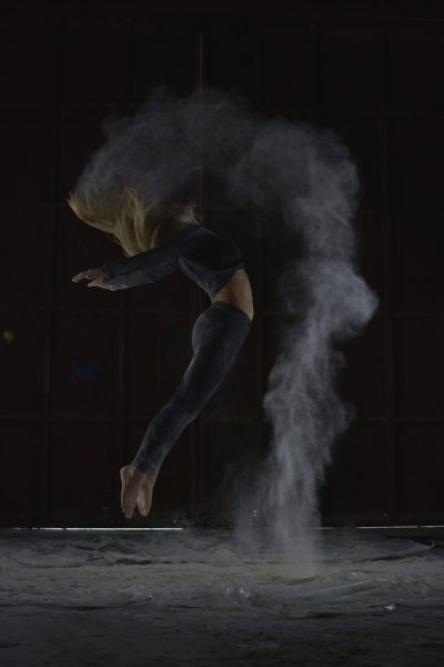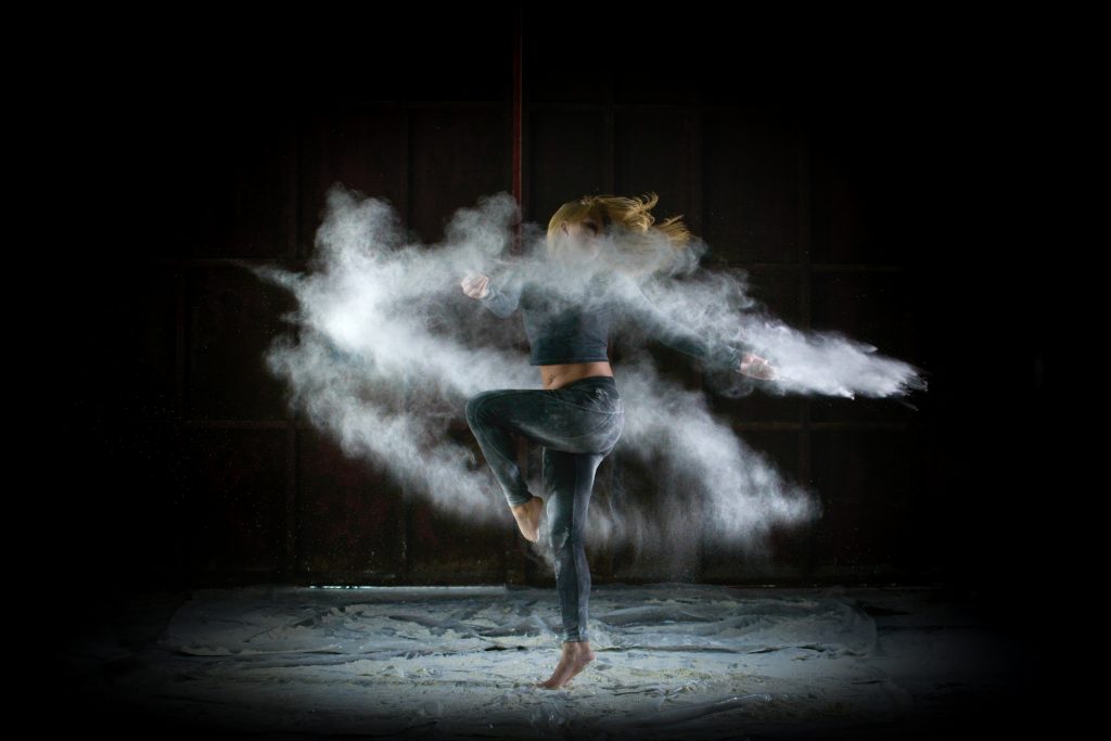 To emphasize the flour me and my team, we chose to shoot in a dark location in combination with three portable lights. We looked for a model and decided to shoot with a poledance-artist because we wanted someone with a high body tension.