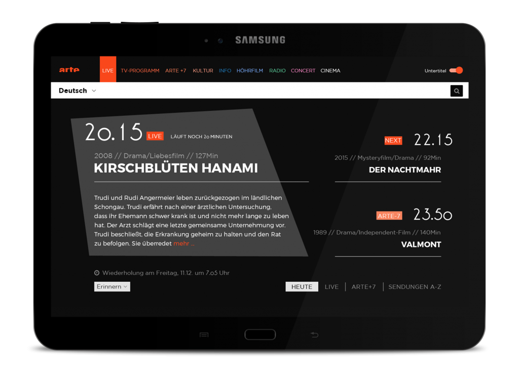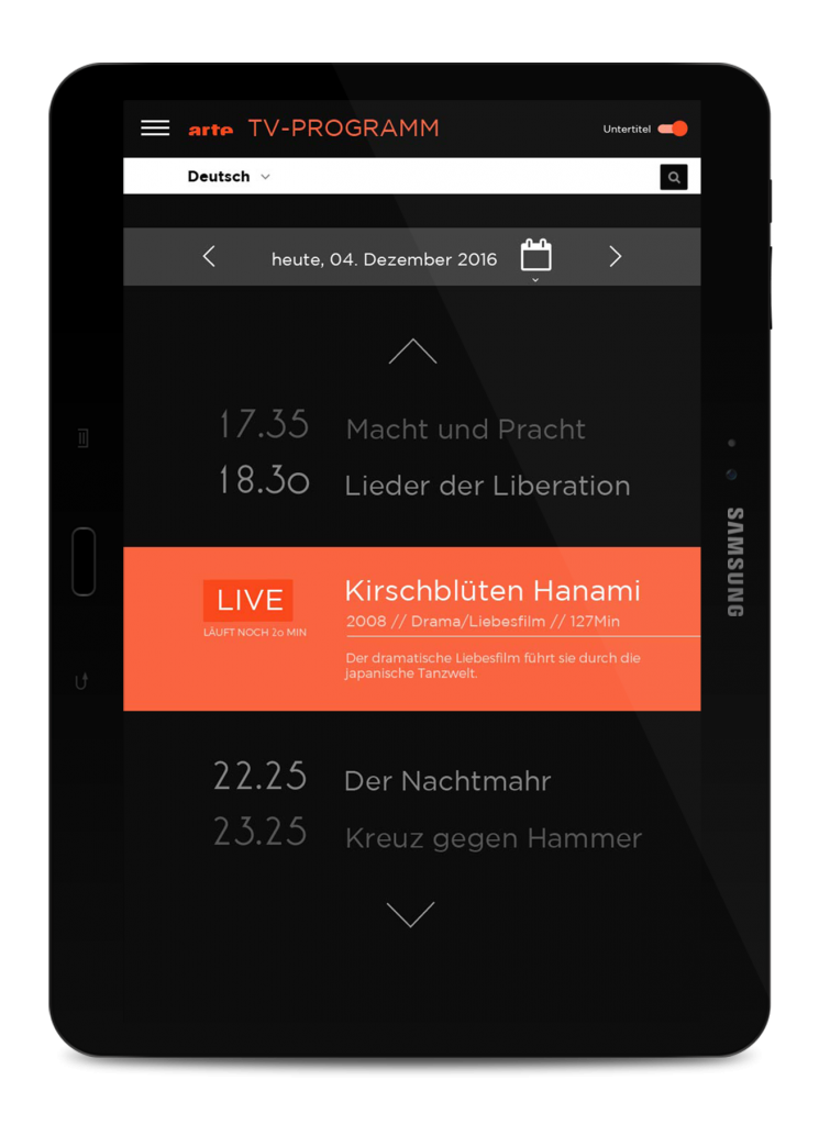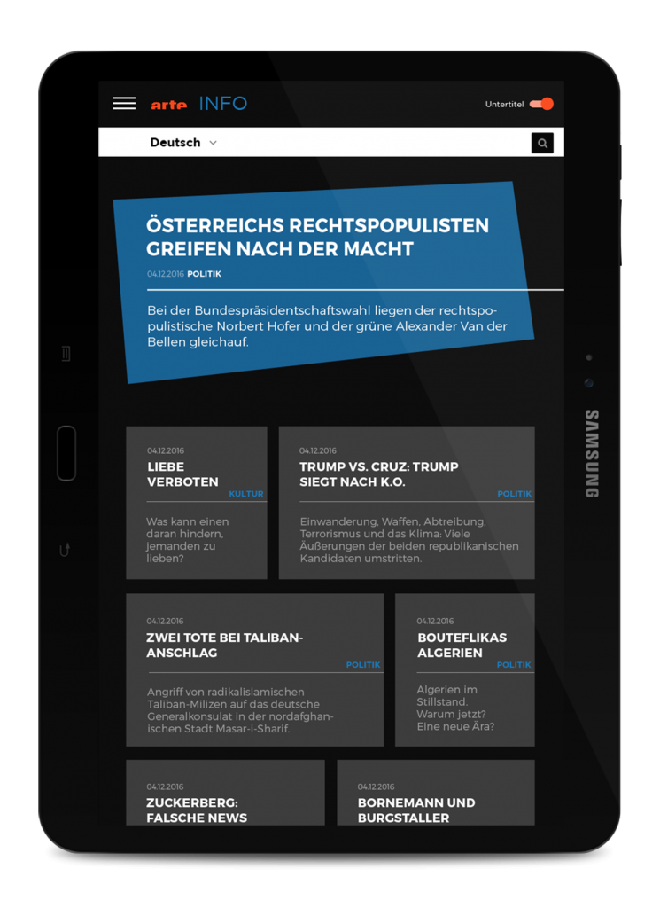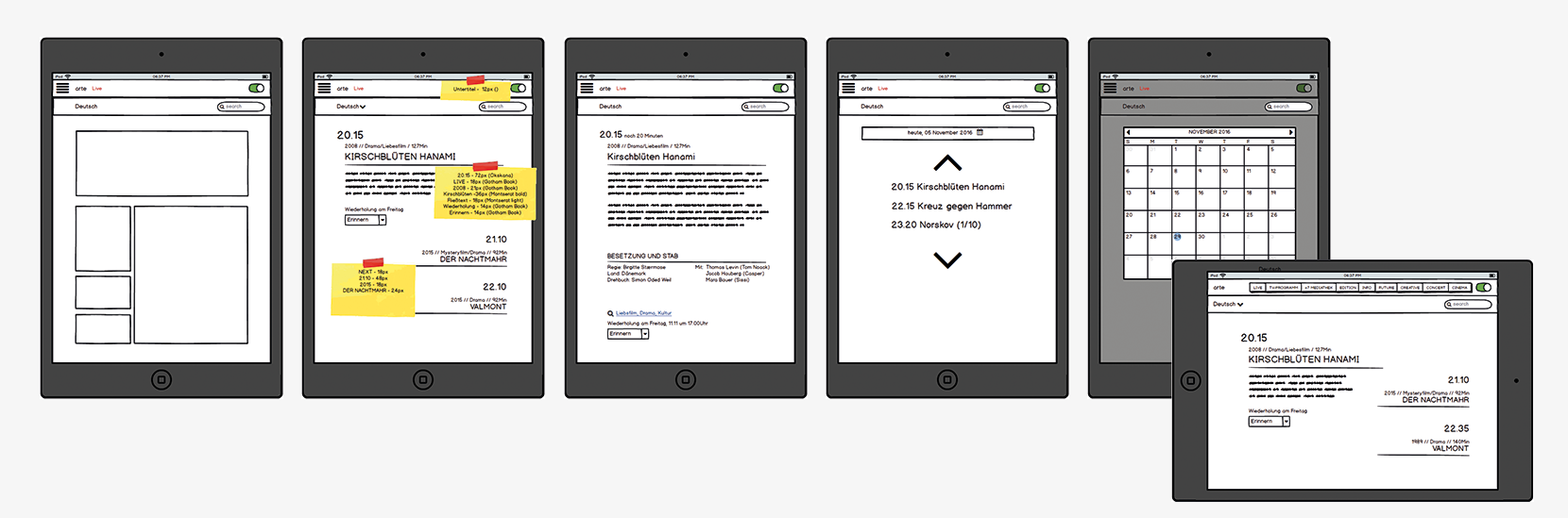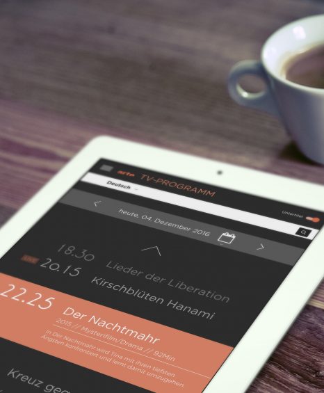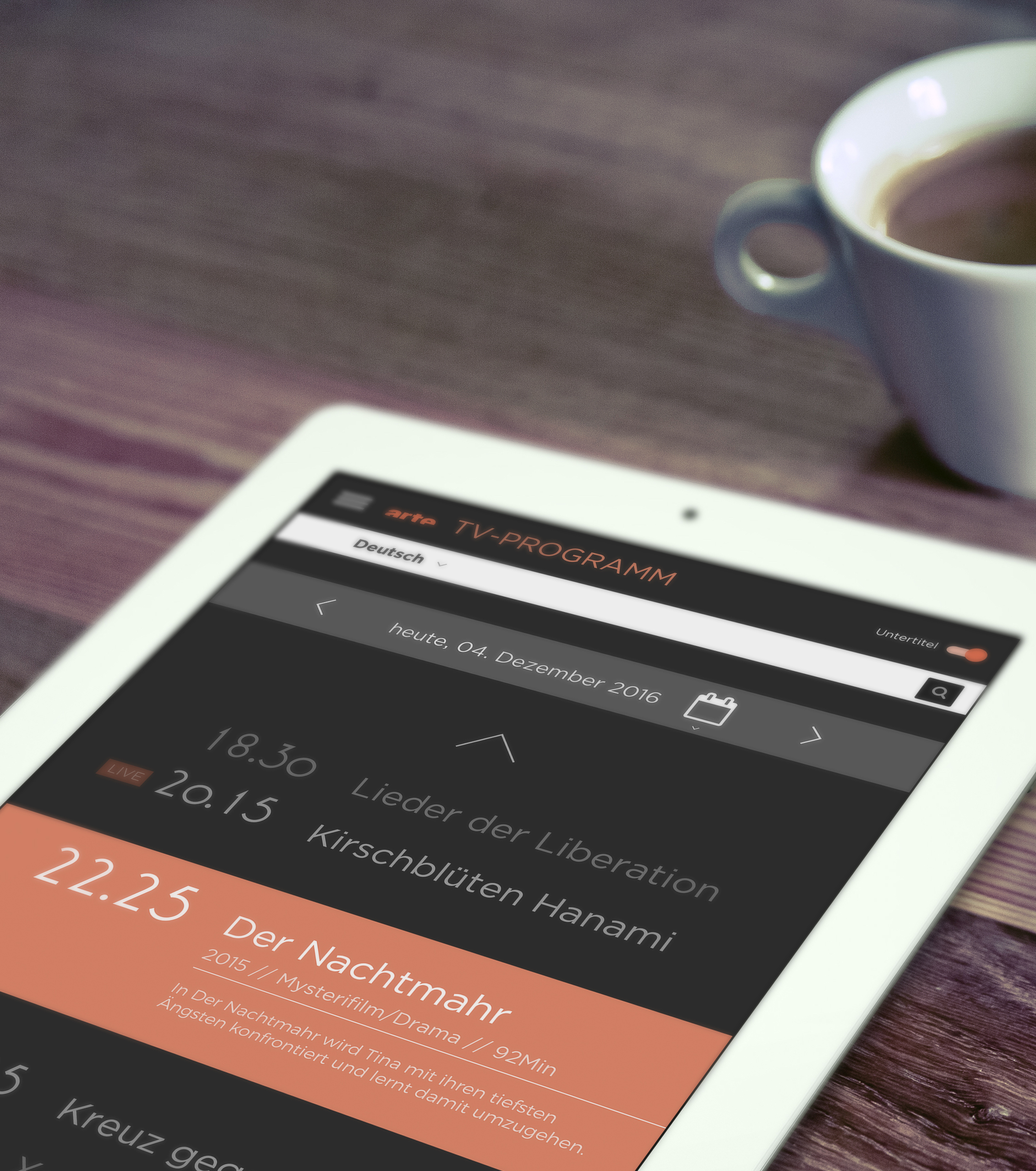 We also took a close look at the Arte website and considered how the style could be transferred to a tablet app and which design elements we wanted to adopt.